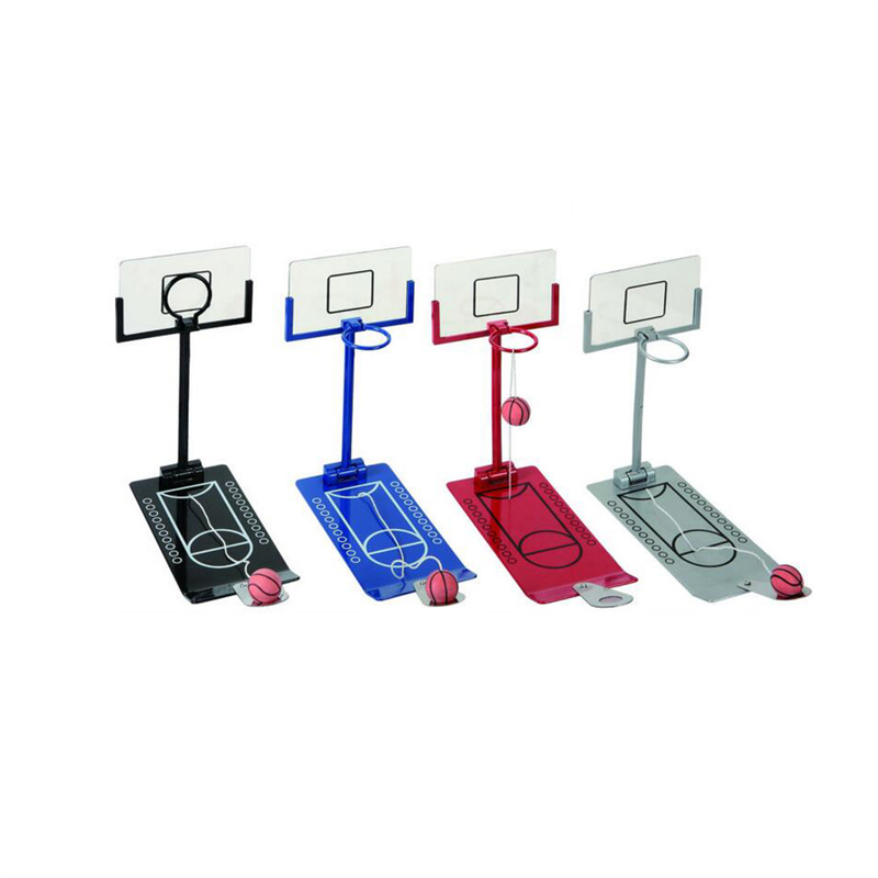 Desk finger basketball toy, metal contruction, plastic backboard and a rubber basketball with a string.Great for office or kids game. Very easy and fun to use.