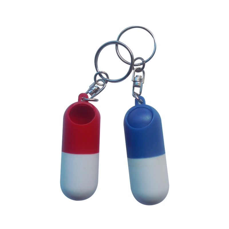 This is an ABS key chain. It's made like a pill. This key chain's color is mixed. You can choose red or blue. Logo can be imprinted on it.