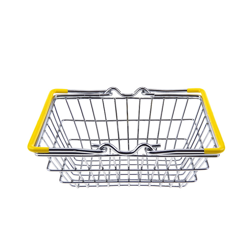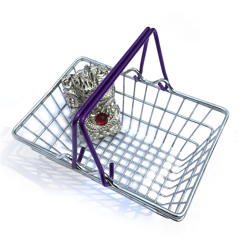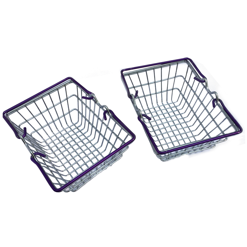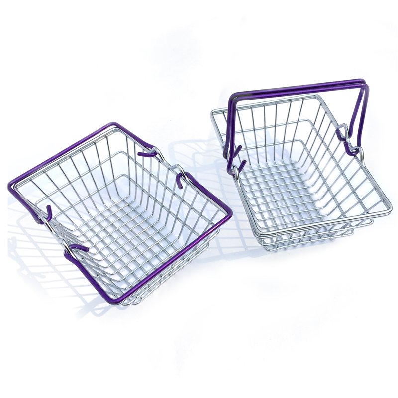 This basket is made of iron. It looks like a mini shopping basket. There are three different size of the basket for choosing. They are 6" x 4.1" x 2.5" , 7.28" x 5.1" x 3.1", 9" x 6" x 3.7". You can put the basket on the table. Some small objects can be put in it. Logo can't be imprinted on it because of the gaps.