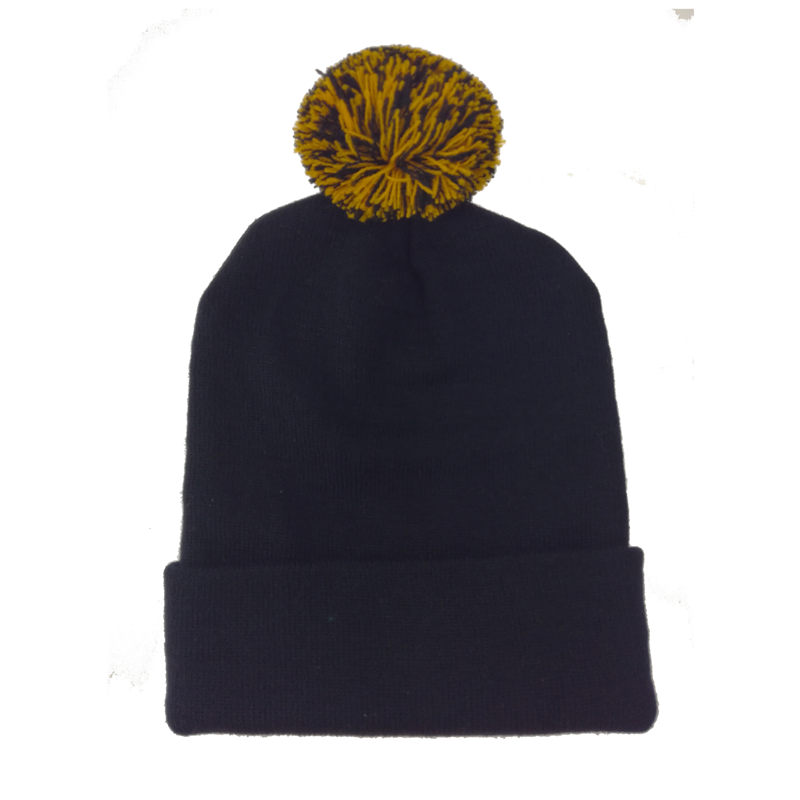 100% acrylic beanie cap with a pom in the top. Cap's size is 11" x 8.50". Woven label in the front is acceptable.