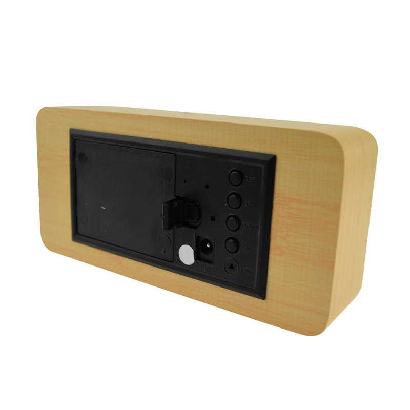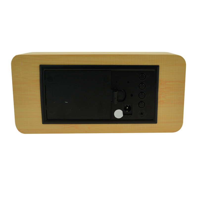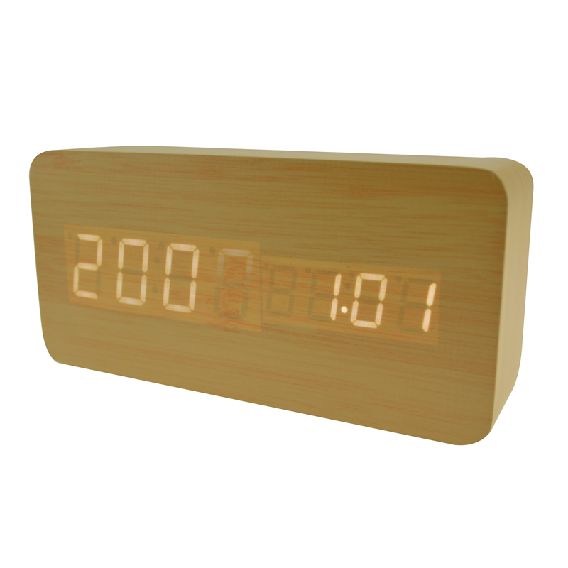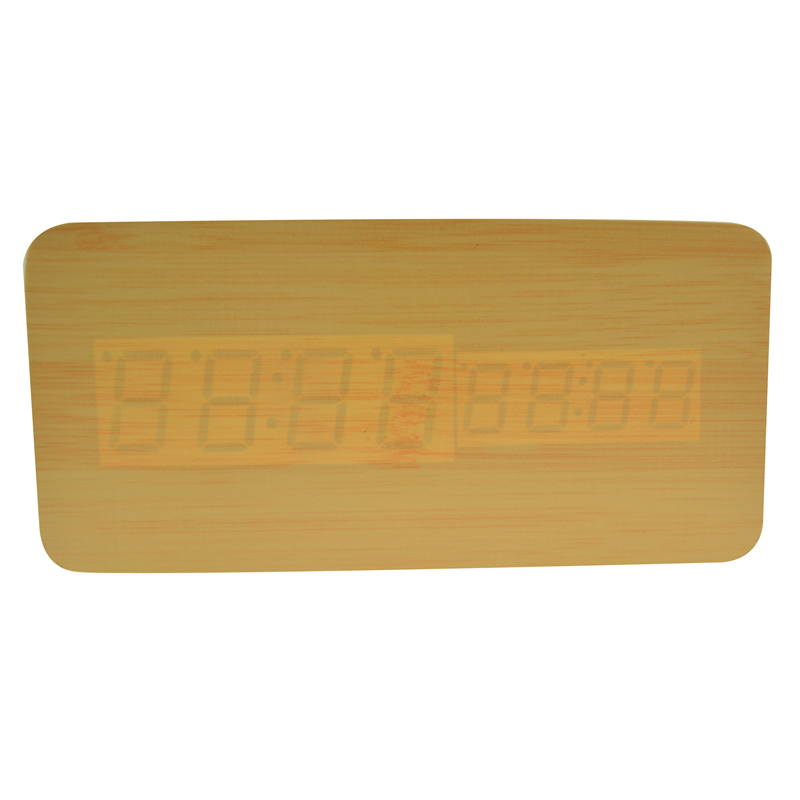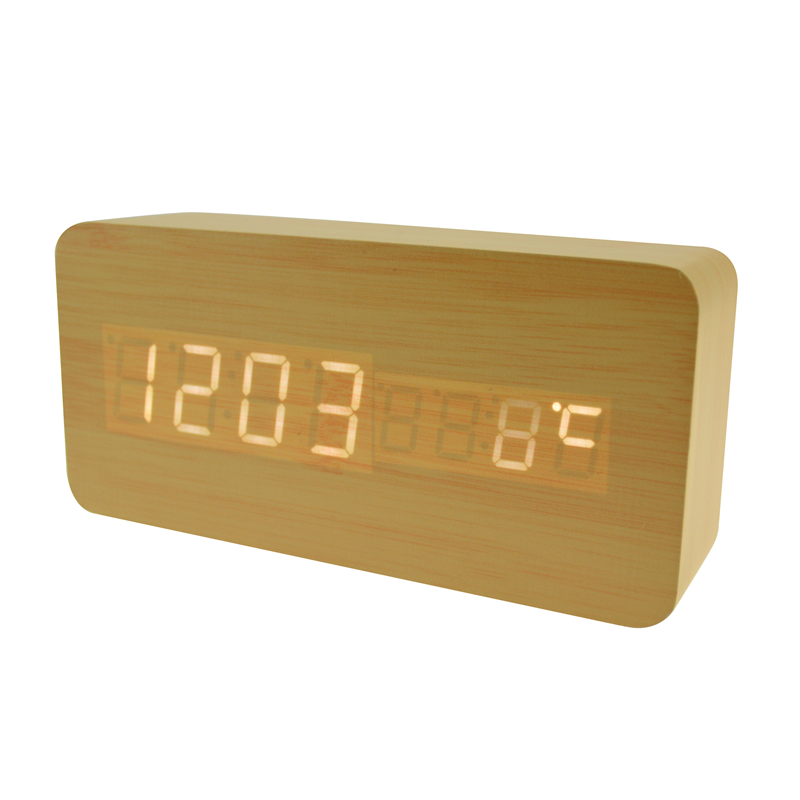 The LED digital alarm clock made of wood.It contains calendar and voice control.Voice control function can be controlled by switch.Time and temperature displayed at the same time.Double screen displayed.After backup battery is put inside, the clock will be still working when powered off.The bulk products are not including battery.Listed prices are for red LED number.Those numbers could be green,blue and white,and prices are different for each color of numbers.Logo could be printed above or below the numbers.