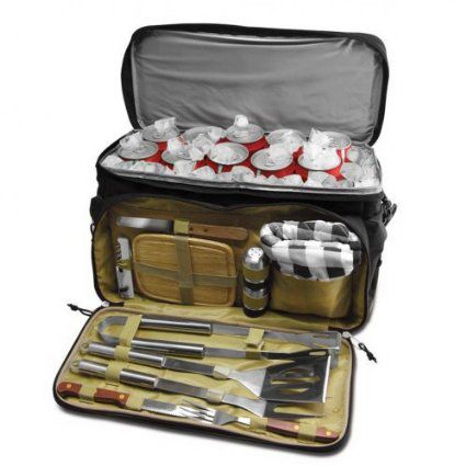 Keep drinks cold and store BBQ tools in 1 convenient bag. The insulated cooler fits up to 10 soda cans, enough for everyone to have a drink. The outside of the cooler features several pockets for all the stainless stee BBQ utensils needed. Use the handle to easily transport everything you need in one convenient black cooler. Company logo and name printing available.