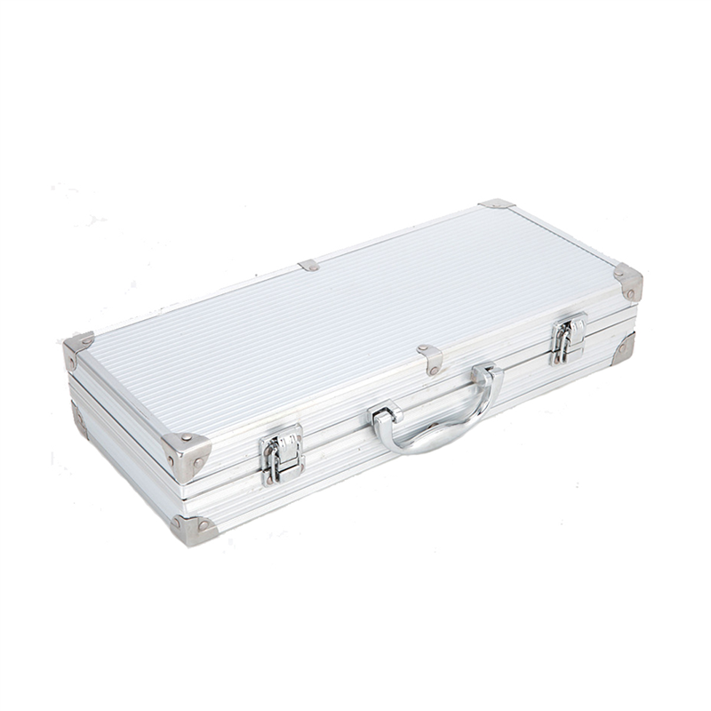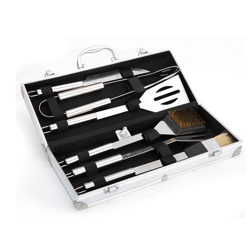 This BBQ set contain 6 tools, they are a stainless steel brush, a spatula, a fork, a tong and a bristles brush. All tools packed in a suitcase, which is very convenient for carry.