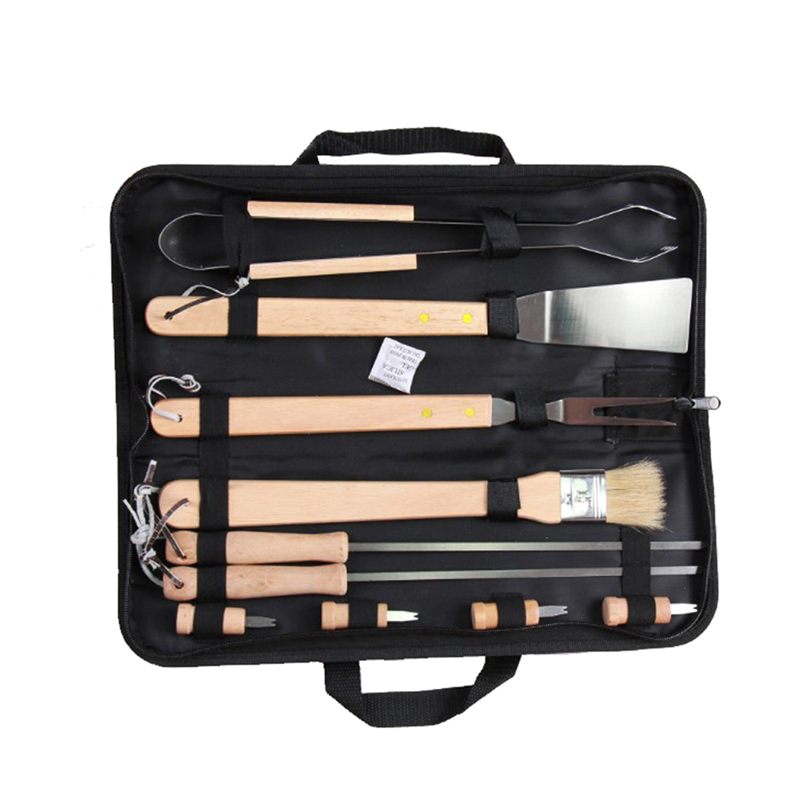 This set is made of oxford fabric,stainless steel and wood. It has 10pcs tools, they are a fork, a tong,a spatula,a bristles brush,2 pcs skewers,4 pcs corn forks. Great for your Barbecue time.