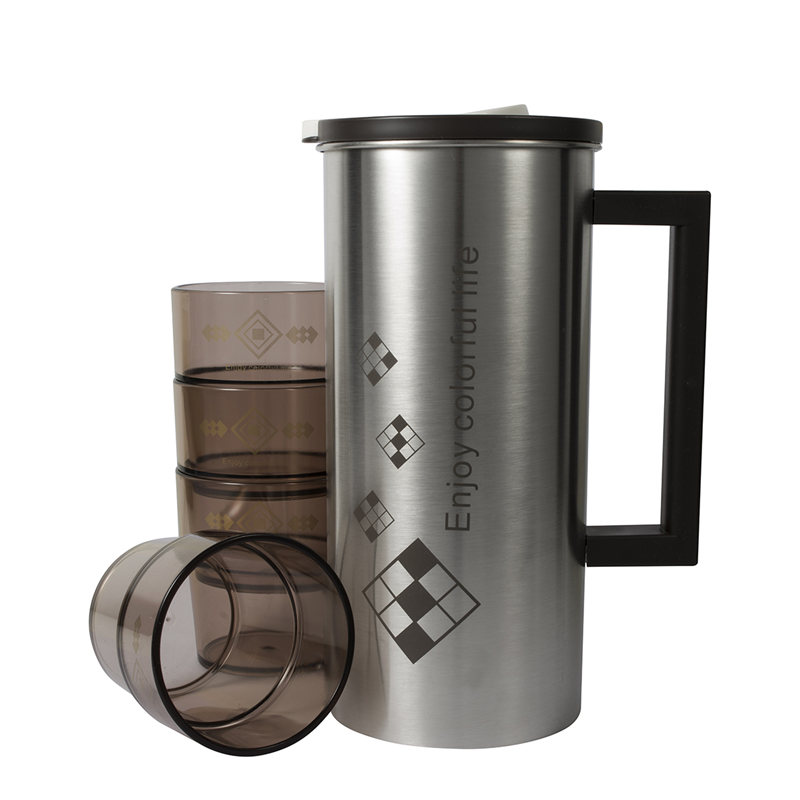 This steel kettle set is made of stainless steel and AS. It has four 14OZ small AS cups in it, which can be used in some places you need. It is very convinent to use or take water.