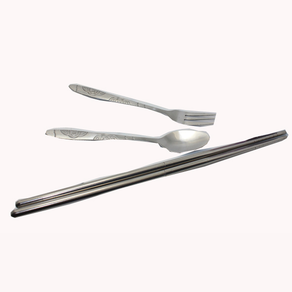 It contains 1 piece fork, 1 piece spoon and 1 piece chopsticks. It is easy to take when you go out to have a picnic or travel. The logo is also can be customized.