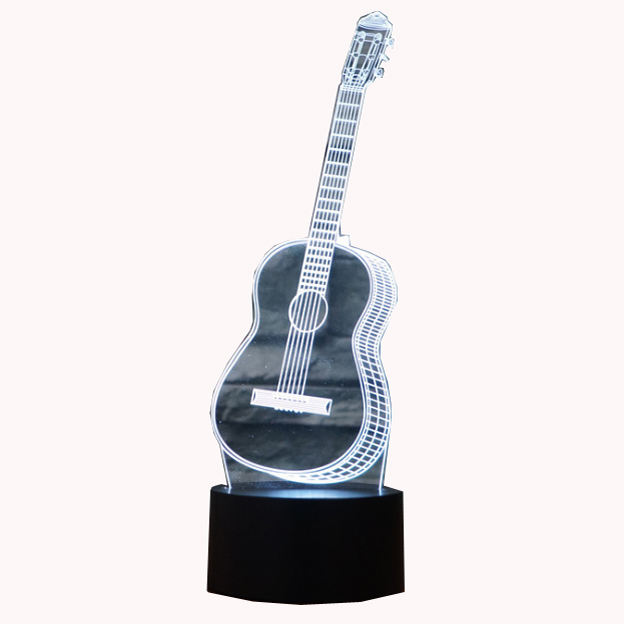 The 3D guitar light uses a 2D flat construction that transforms into an illuminated 3D object,create a 3D effect,this night light can give someone a warm and romantic feeling.This table lamp have red,green,blue,yellow,cyan,pink and white, choose and enjoy your colorful life.