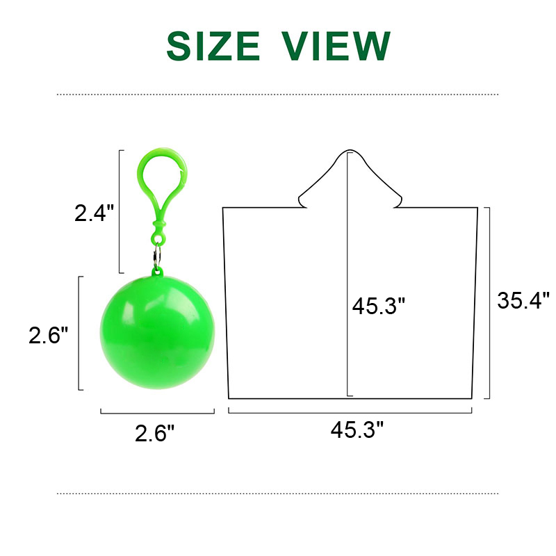 This disposable raincoat can be made into biodegradable materials, environmentally friendly. It is a foldable outdoor essential thing in your travel. You can enjoy your hiking or camping even the rain is coming. Comes in plastic balls that easily clip to your backpack or purse. Keep them in your car trunk or glove compartment for quick access. These are just what you need for attending ball games, outdoor concerts, and other events where you might get caught in the rain. Also used by students, gardeners, and construction workers. Many people are buying several sets so they always have lots of rain ponchos on hand. These make a wonderful gift for friends, family and co-workers.