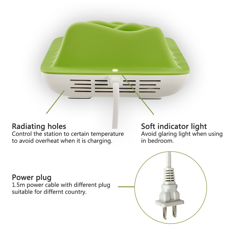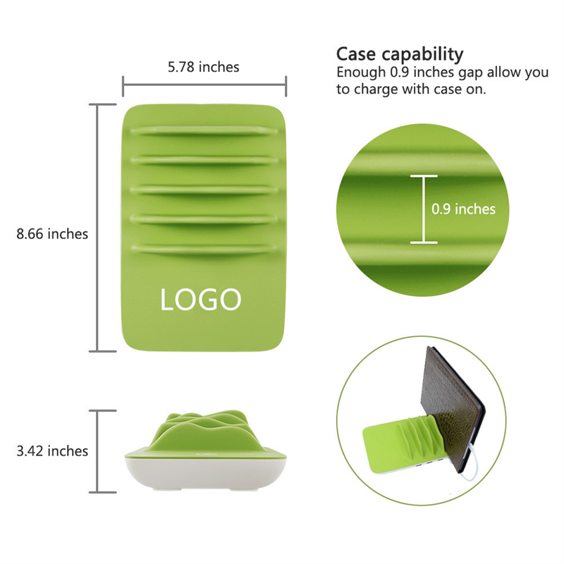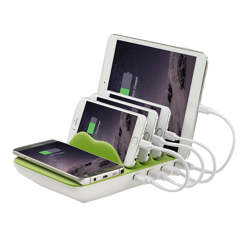 The wireless charging station is made of fireproof ABS and silicone.with 1 qi wireless charger and 4 USB charging ports for smartphone, tablet, kindle with small IC inside(2A).It has unique design and soft indicator light. Good gift for promotion.