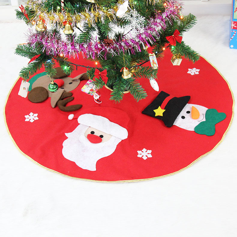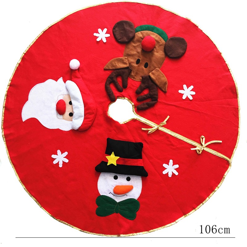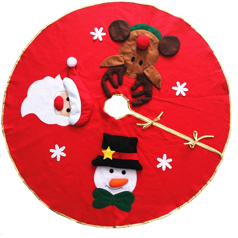 Add the finishing touch to your Christmas decorations with this cheeful tree skirt. Santa, Rudolph, and a snowman adorn this fabric at the bottom of the tree to ensure a joyous holiday season. Also enjoy the ease of cleaning up after the holidays with its convenient and easy to use design.