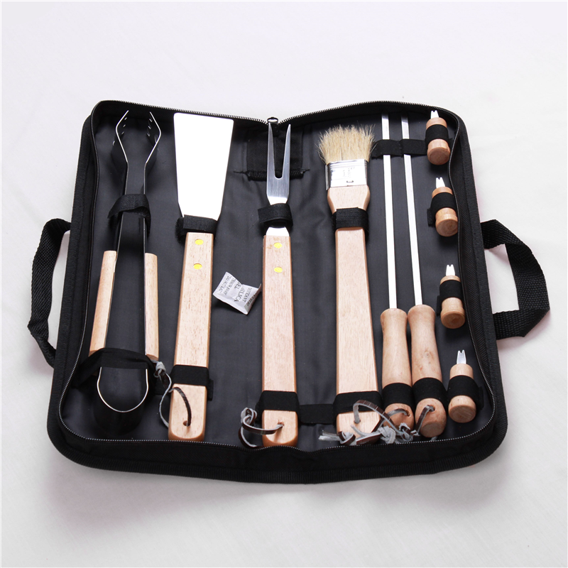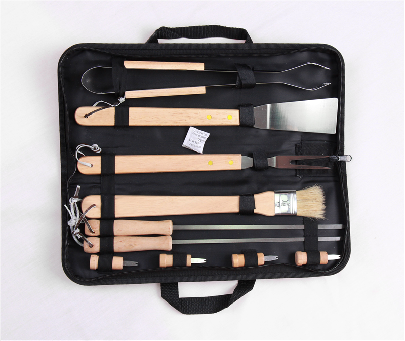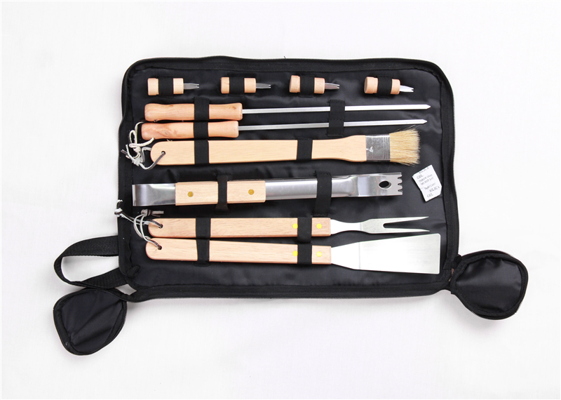 Our BBQ utensil sets are well made of high quality and sturdy stainless steel and wood, which makes the set extremely durable and last for a long time. Grill set comes with a lightweight and delicate case, makes this a great BBQ grill gift set for Father’s Day, for brothers, friends, or anyone you like. They also can be great outdoor BBQ, cooking and grilling accessories and tools for a picnic, for party, for tailgating……Your company logo and name can be customized.