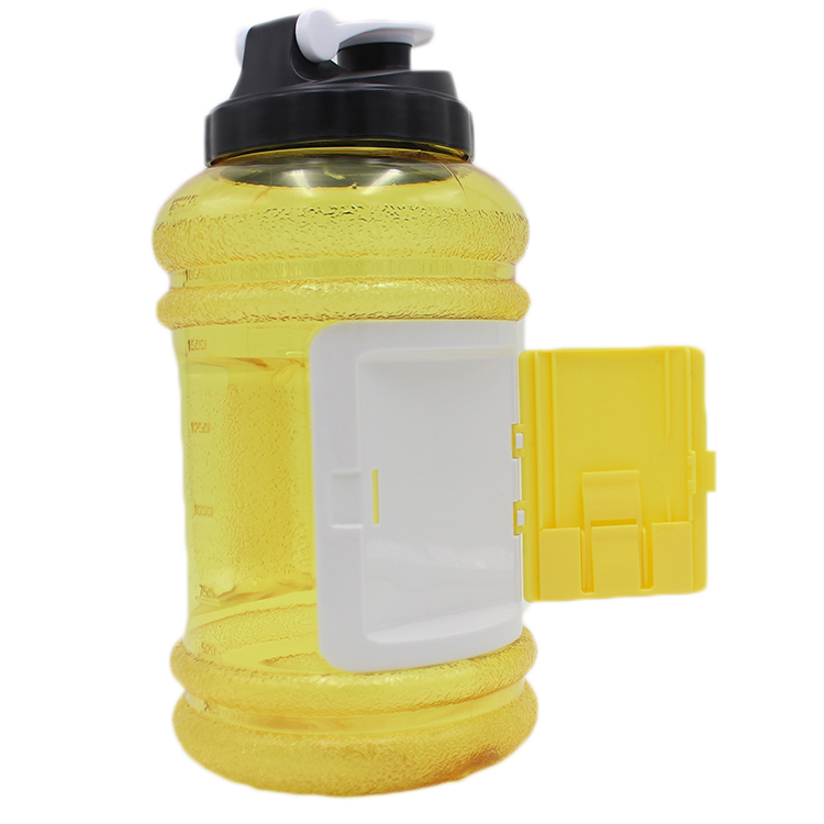 It is 2.2L capacity bottle, with storage compartment, can insert your bank card,ID card. Logo can be customized.