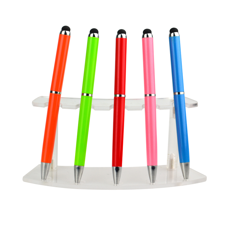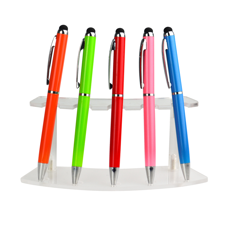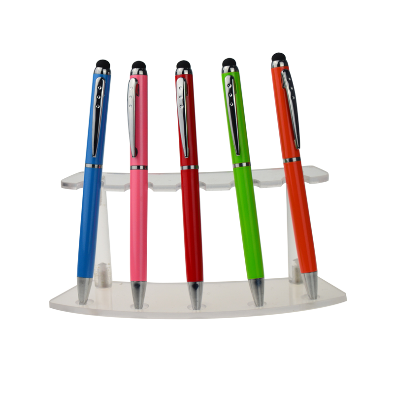 This twist ballpoint pen is made of aluminum painted in different colors. Its top has the function of touching screens. Logo can be customized on the barrel. It is about 5.3'' in length and 14.6 grams weight. Conventional colors are red, pink, blue and green.