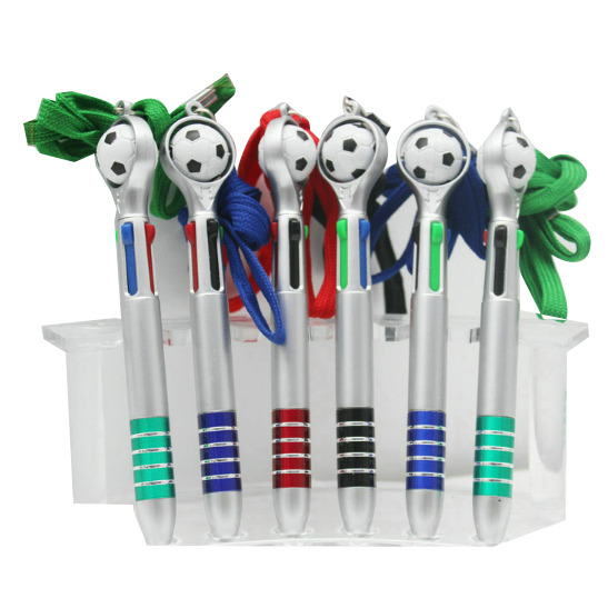 The pen is made of plastic. Four ballpoint pens and each ballpoint pen has four colors inks(black, red, green and blue).And with lanyard on each pen.Company logo and name can be imprinted.