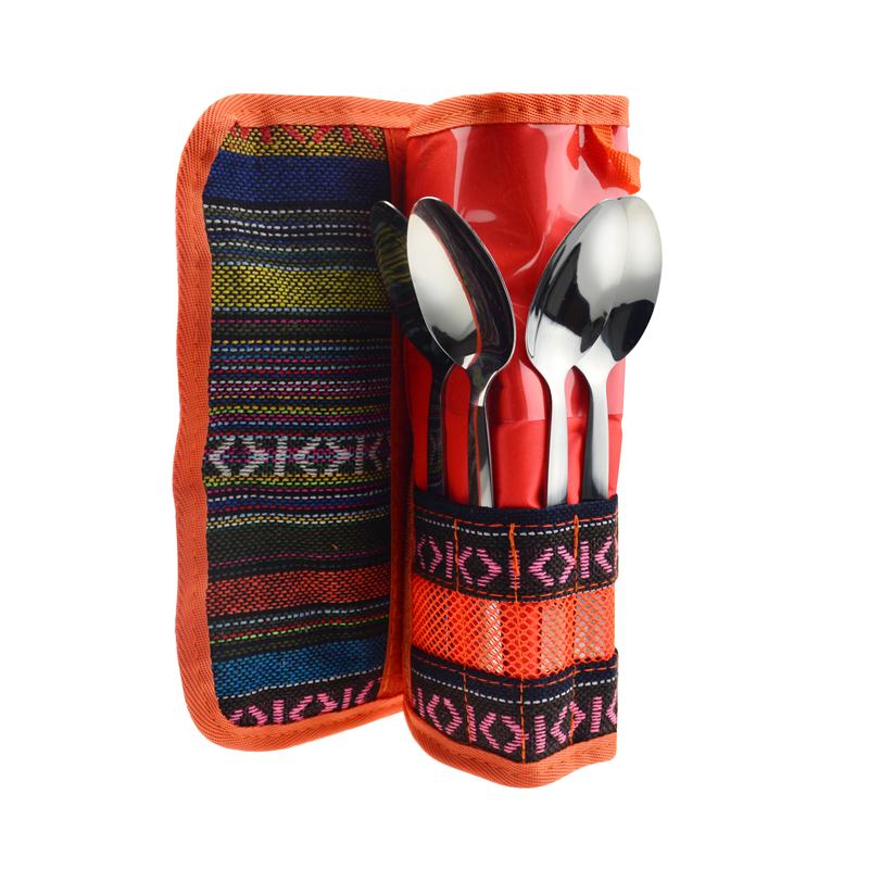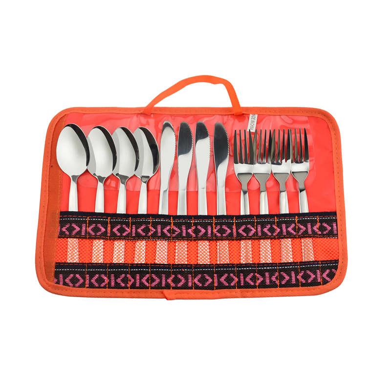 This cutlery set is made of stainless steel, 4 forks, 4 spoons, 4 knives are packed in a customized canvas bag, it is easy to carry and hang. The customized logo can be printed on the bag and the cutlery.