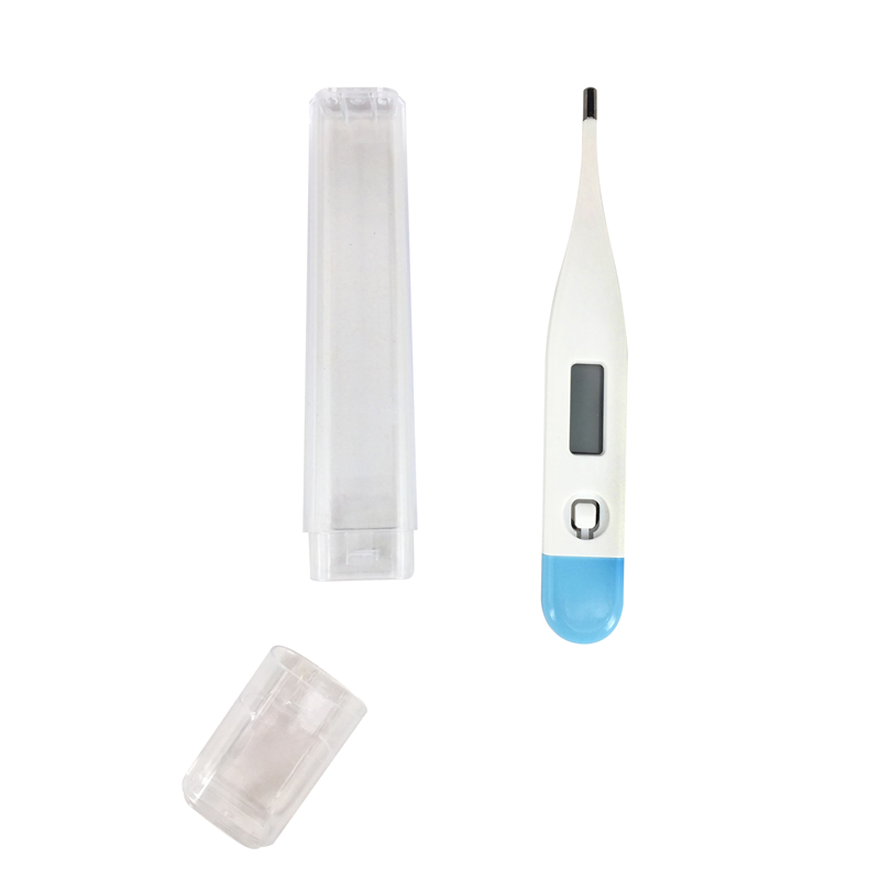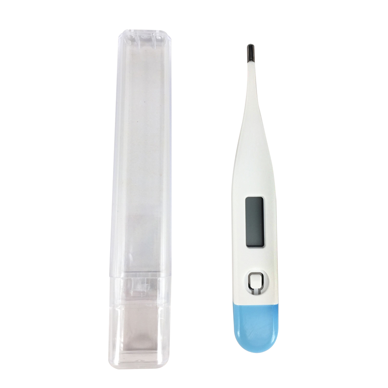 The thermometer is made of ABS, it has a LCD readout, a round edge and the hard tip, comes with a clear case. It will beep at the peak temperature within 60 seconds with automatic turn-off. Logos can be printed on the clear case or item body.