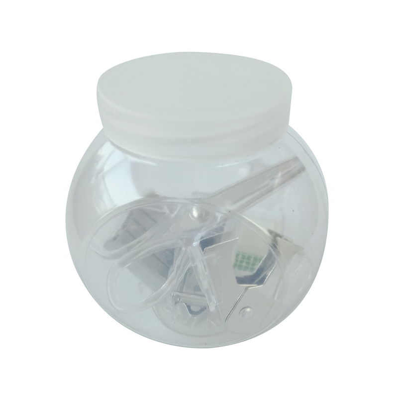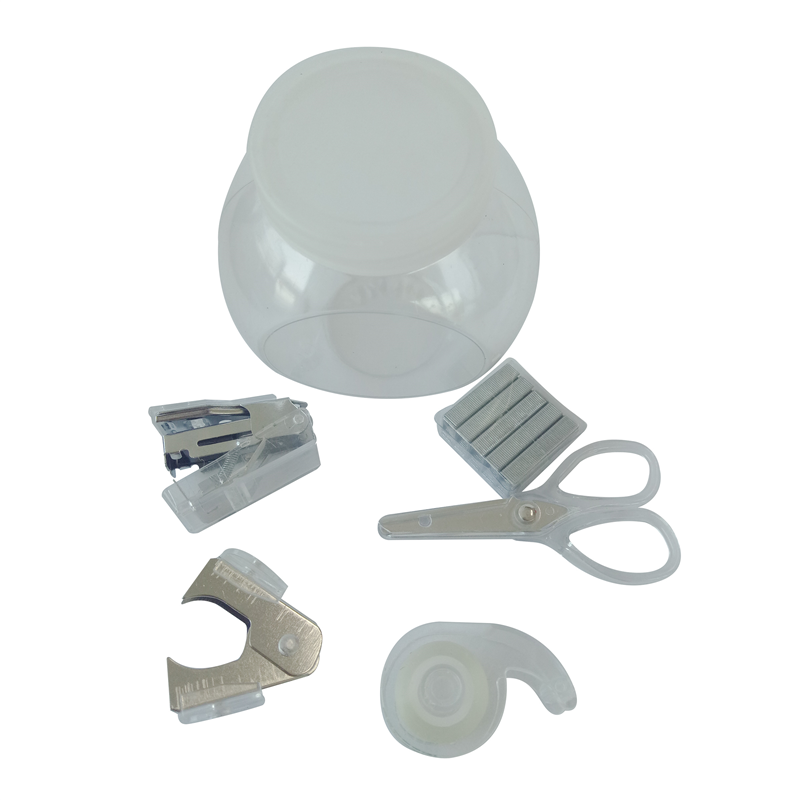 This mini stationery set consists of a mini scissors, stapler, staples, stationery tape, tape dispenser, and stapler remover. It is made of high quality of plastic. Logo can be printed on the front or back side of the clear bottle.