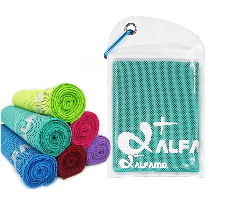 This cooling towel is made of polyester cooling fabric. It can bring you cool feeling when you feel hot. It is packaged with durable reuseable environmental PVC bag. Your company logo can be printed on the towel and PVC bag.