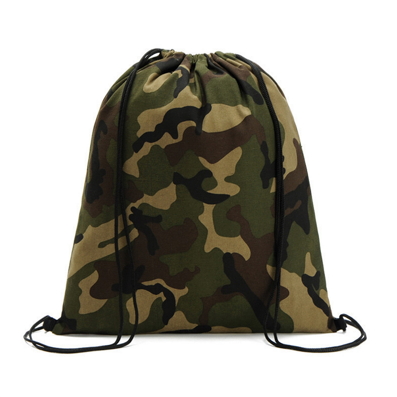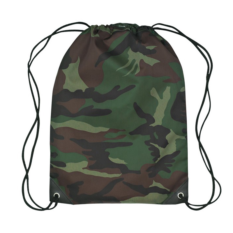This camo backpack has woodland camouflage pattern, reinforced corners with metal grommets and a black drawstring closure. This is great for quick hikes and other woodland day-trips. Camo pattern will be different for each backpack.