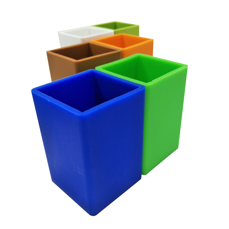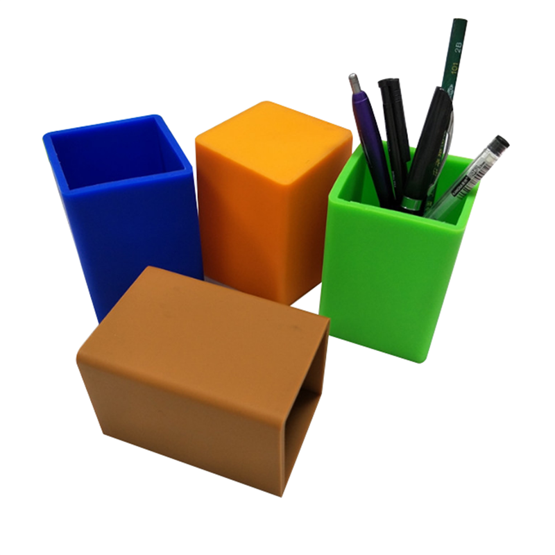 It is made of silicone. Colorful Silicone Rubber Container to hold your creativity tools. This pot is an elegant desktop container for all your pens, pencils, markers and brushes. Company logo and name can be imprinted.