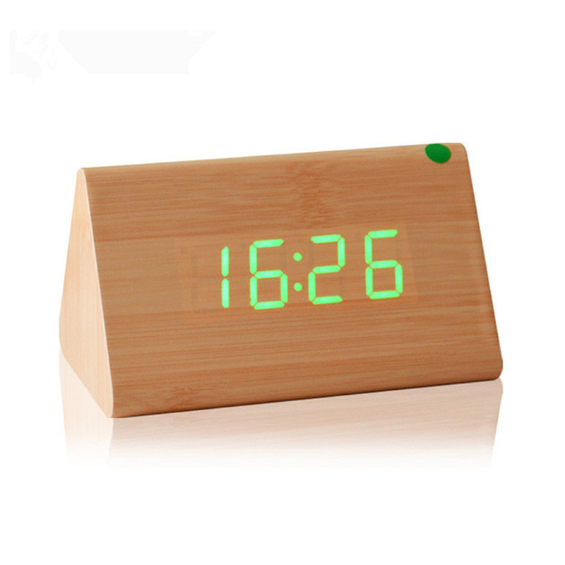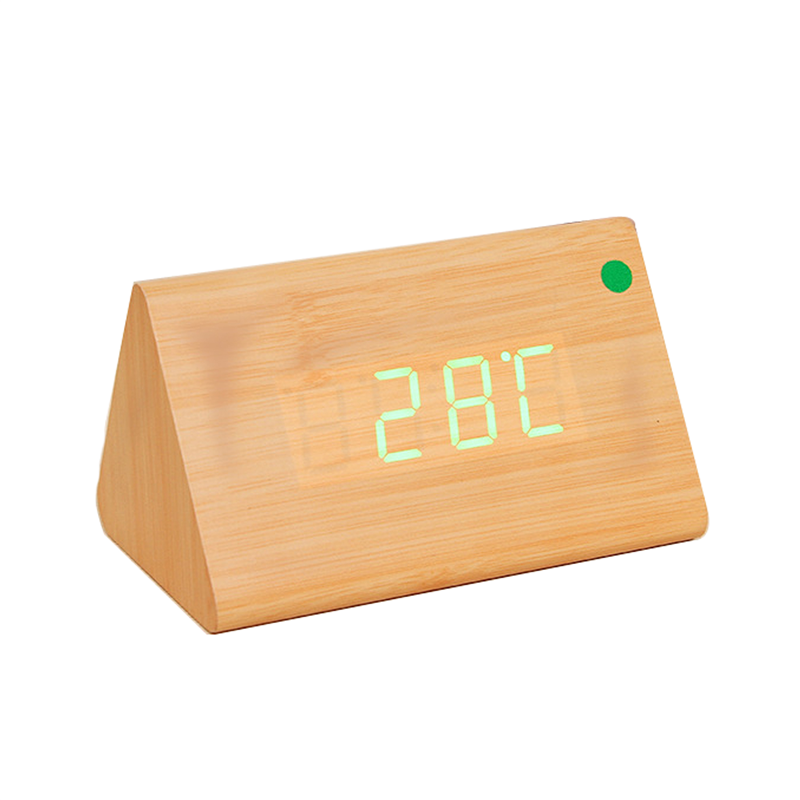 This triangle clock is made of wooden. It can not only display date, time and temperatuer, also you can set your alarm clock. Besides the green display, red, white and blue are all optional.