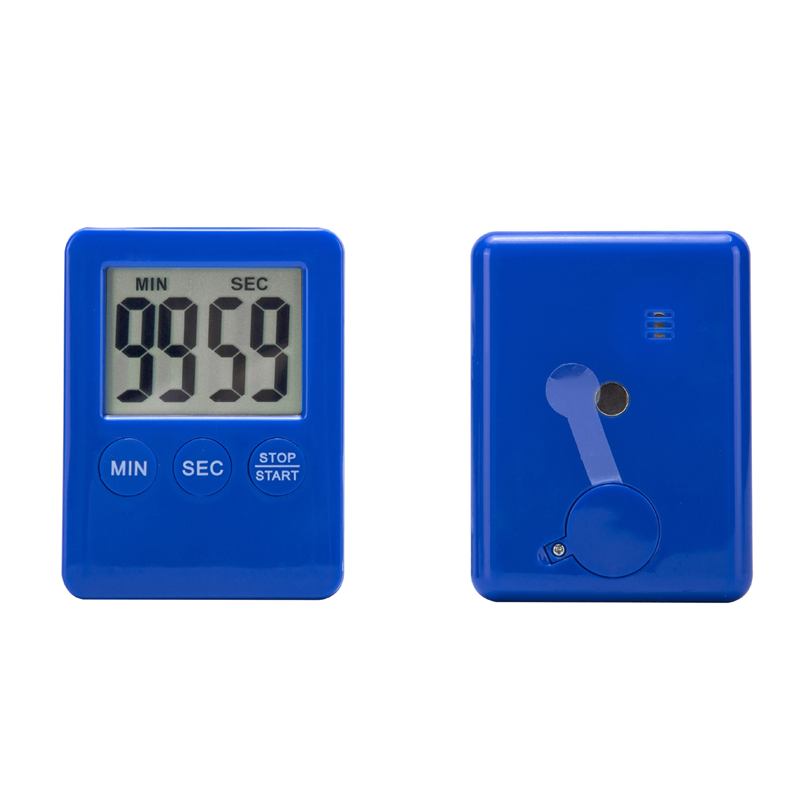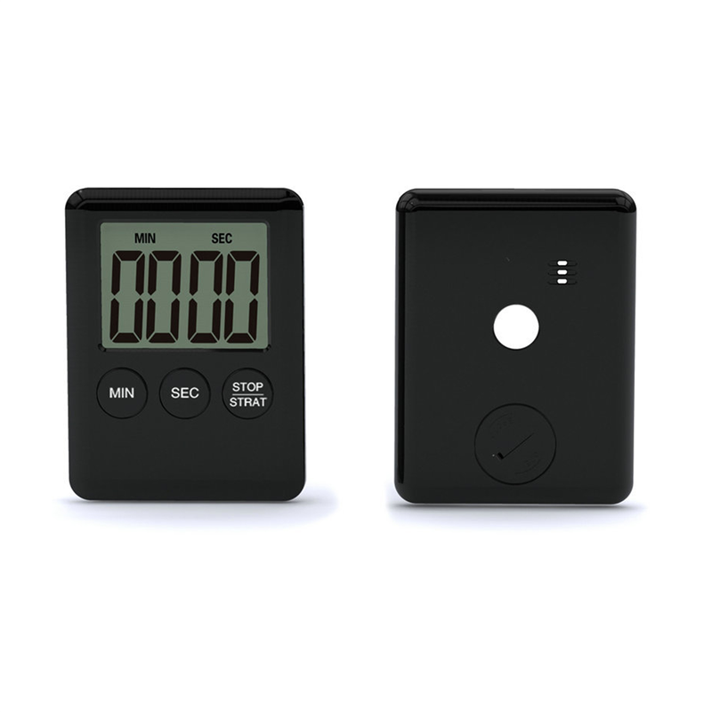 Pocket kitchen timer, ABS material. The timer size is 2.75" x 2.08" x 0.35", and the screen size is 1.42" x 1.06". It has a small magnet on the back, so you can put the timer on refrigerator or other metal material.