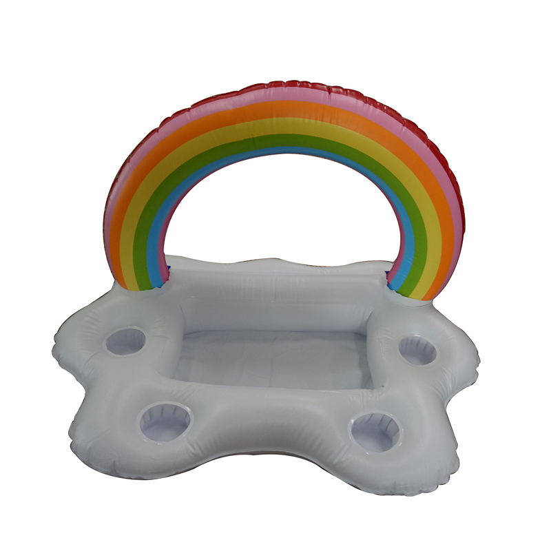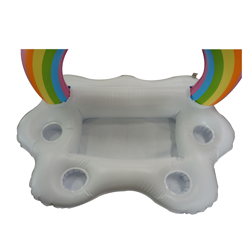 This drink float is made of thick PVC material, with 4 cup holders for party cups, cans, or bottles, and one big hole in the middle for snacks salad ice. It is a great addition for the pool, lakes, hot tub, parties etc.Logo can be printed on the white area.