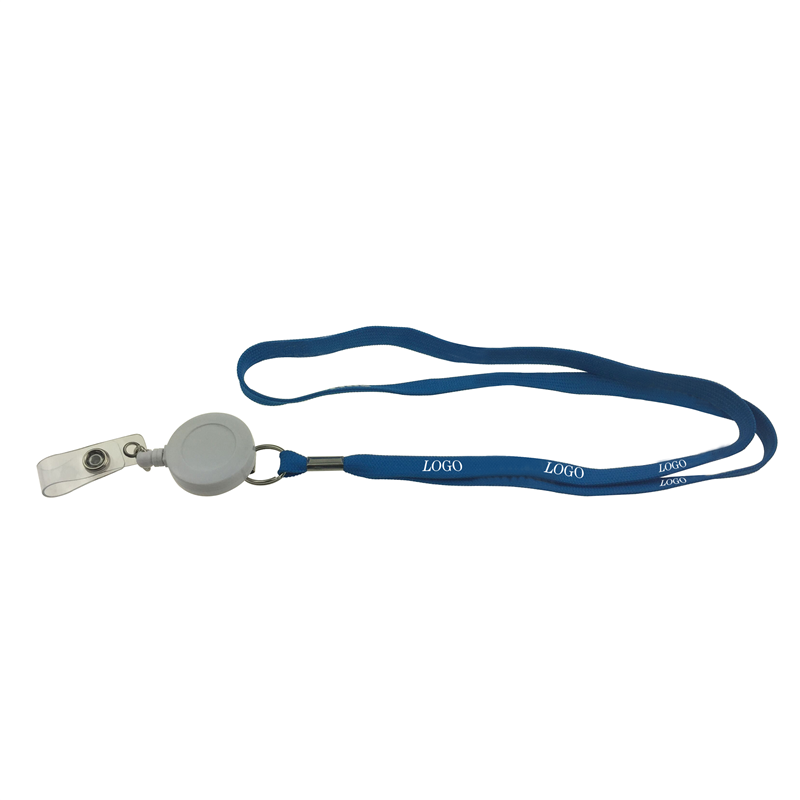 It is made of polyester material. It has a white retractable badge reel, and the material is plastic. logo can be printed on the rope.