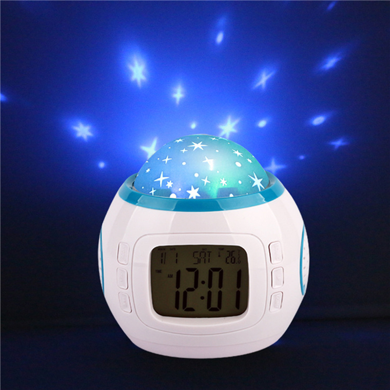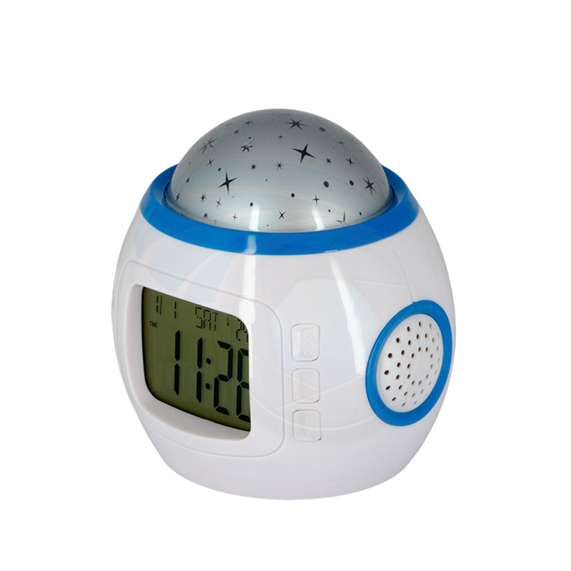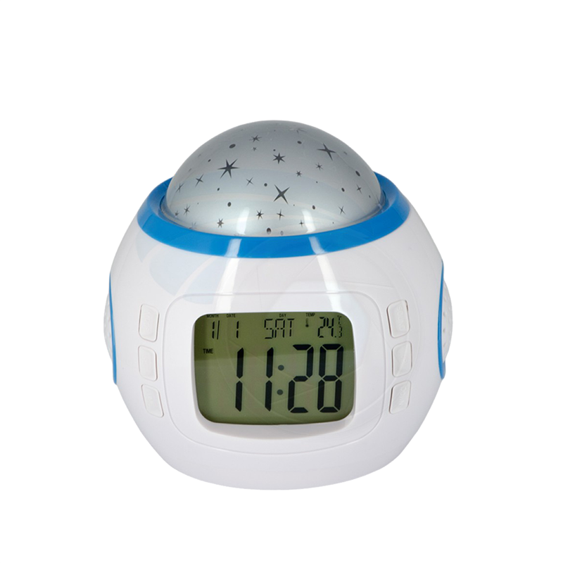 It is made of ABS, and display time, date, week, month, year and temperature. there is four natural sound songs and six chord songs for you to choose. It would have dynamic projection of colored starry sky accompanied with music rhythms. Your logo can be customized on clock.
