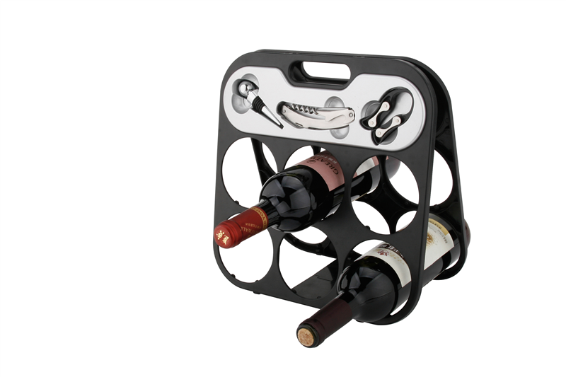 This oldable 6 bottle ABS wine rack with 3 pc accessories, wine stopper,wine corkscrew,foil cutter. Perfect to display your favorite wine on the kitchen, counter top, or bar table. Company logo and name can be printed on the box.