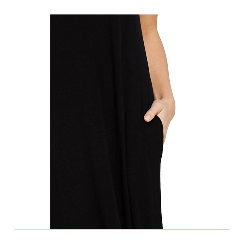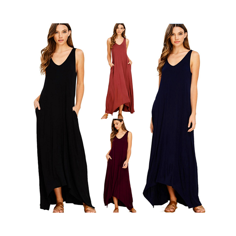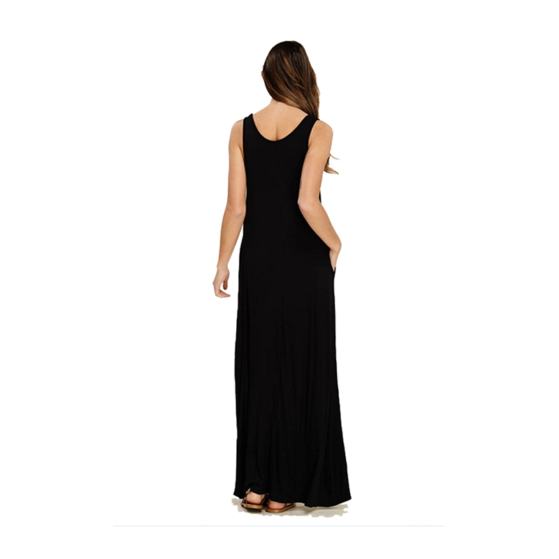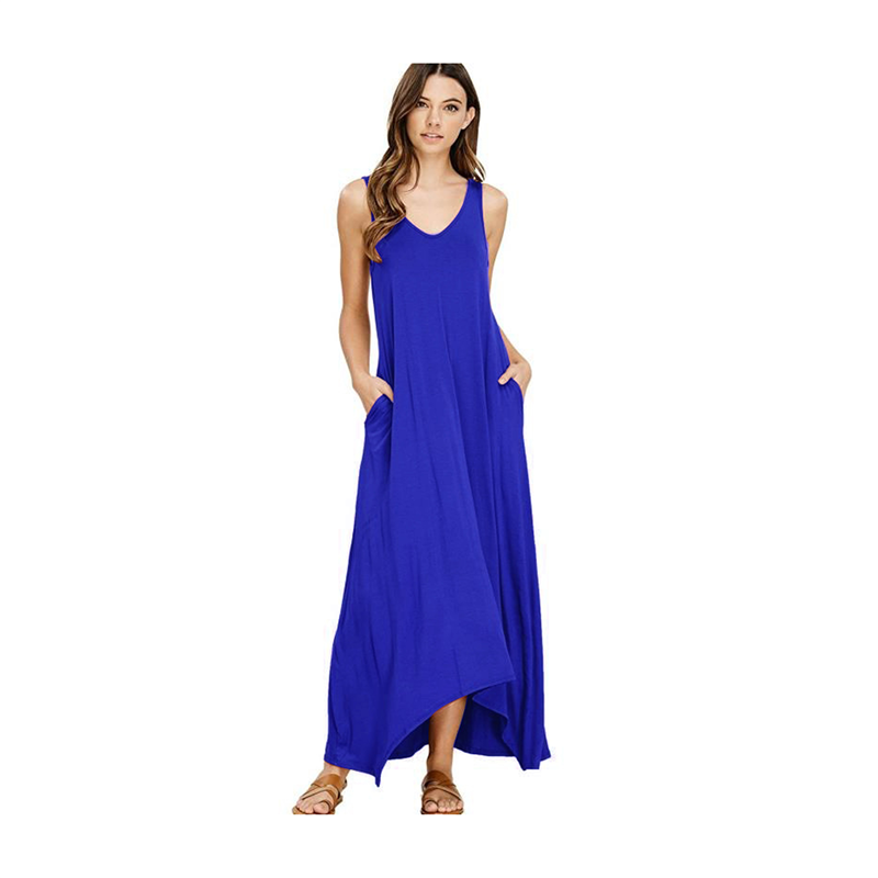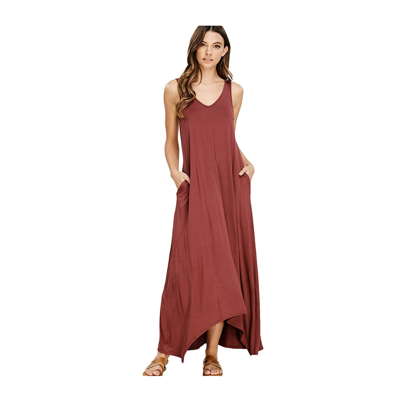 Women's casual V veck sleeveless tank top long maxi dresses with pockets, 95% rayon/5% spandex.Two side slant pockets to carry your needs. Deep V front and round scoop neck back detail special ocassion.