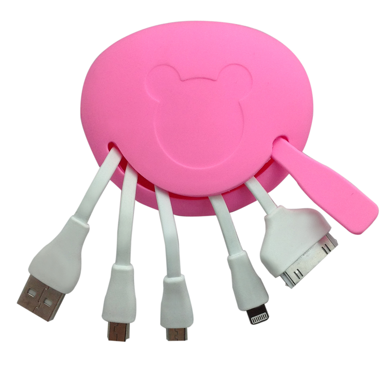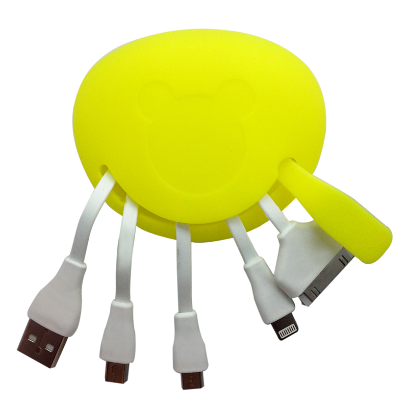 It is coming with 1 silicone smile face case, 5 different port(USB, Type C, Micro, 8Pins, 30Pins), USB charging and data sync capabilities. Packed with colorful clear box.