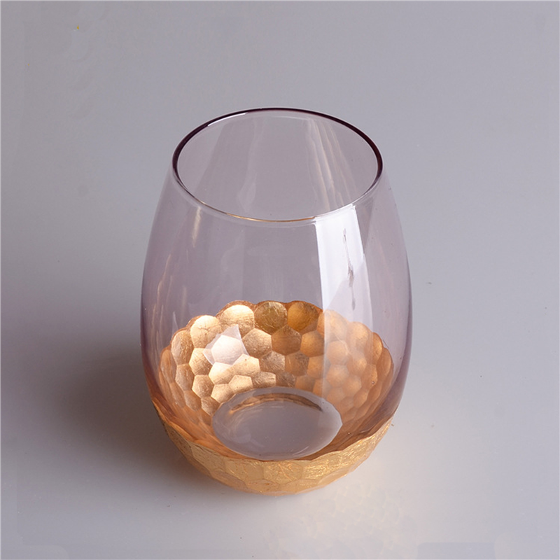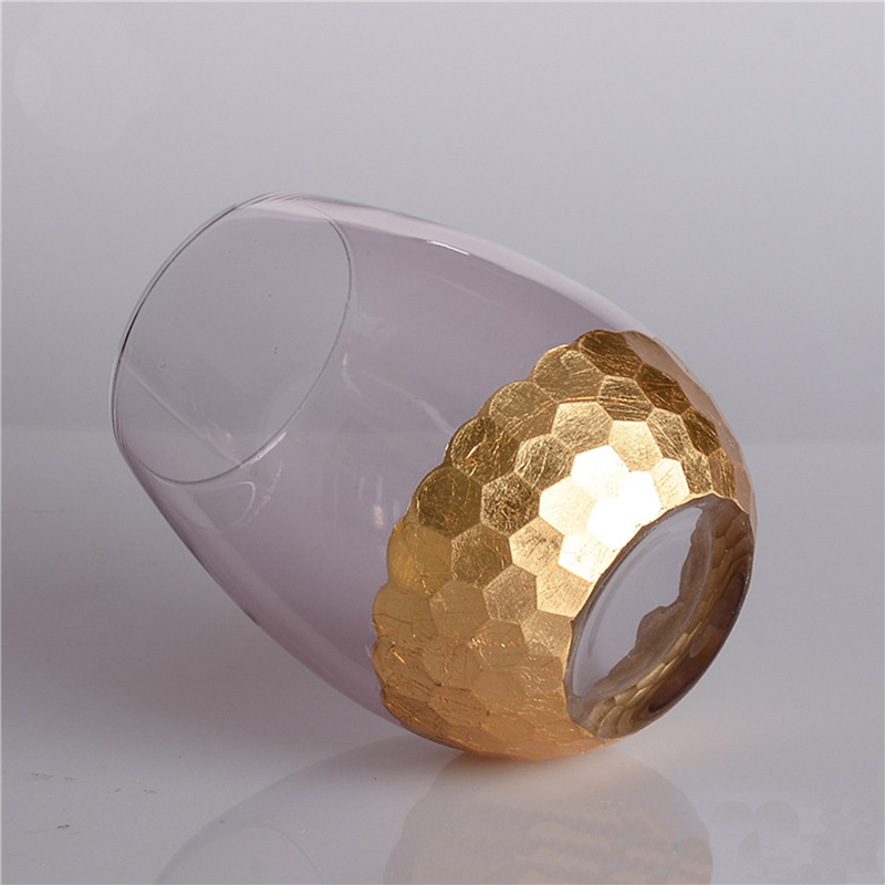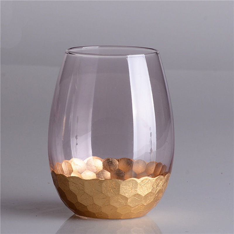 The egg shaped wine glass with gold foil at bottom is made of sodium calcium glass, 14 oz capacity.