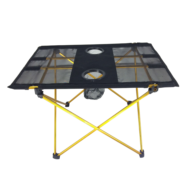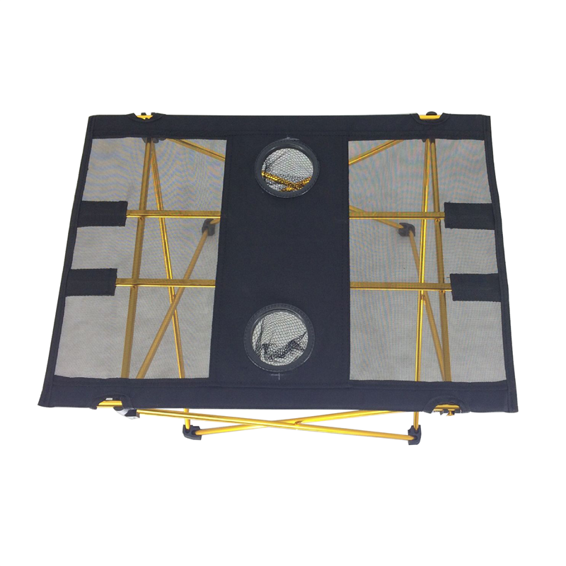 This table is made of aluminum alloy tube and mesh polyester, coming with 2 fabric canister holder, the loading capacity is 50lbs.