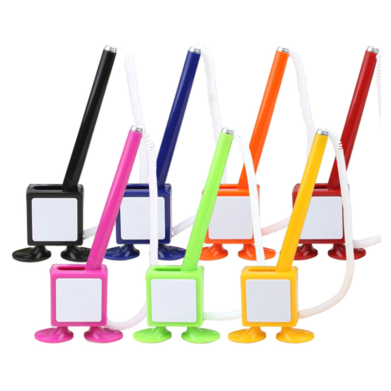 Cute ballpoint pen with a Stand. Peel-and-stick adhesive bottom allows you to glue the pen to your desk or table, so it always stays put. The quality pen is connected to the adjustable counter stand with a retractable spiral coil cord. The cord guarantees this promotional pen will never go missing! Perfect for banks, insurance companies and automotive related companies. Comes in a selection of colorful options. Your brand can be printed on the holder or the pen itself! Ink color: Black or Blue
