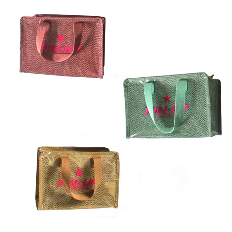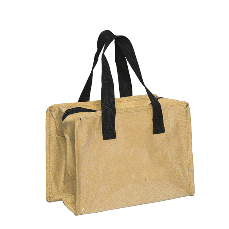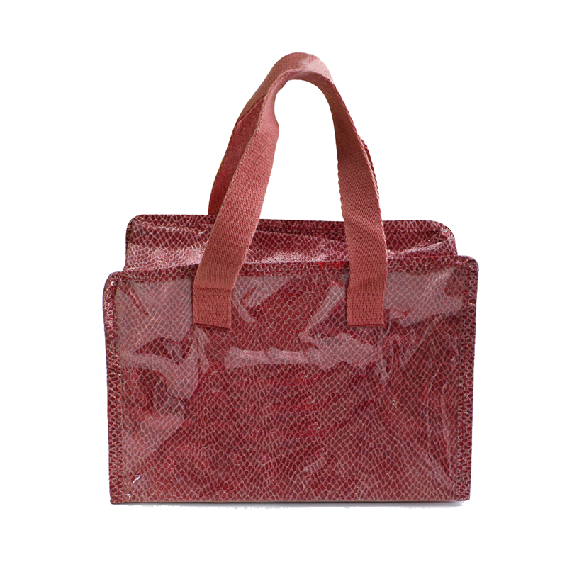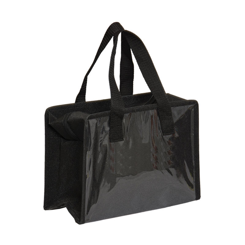 This tote is made of 70g non woven with clear PVC lamination. Easy clean exterior, top zippered closure and two webbed handles.