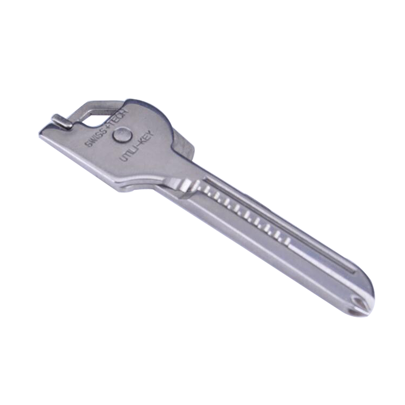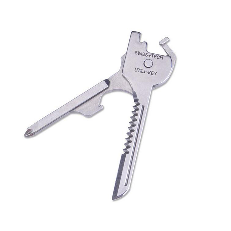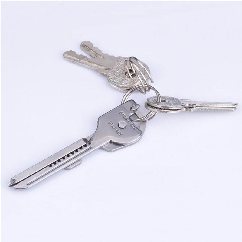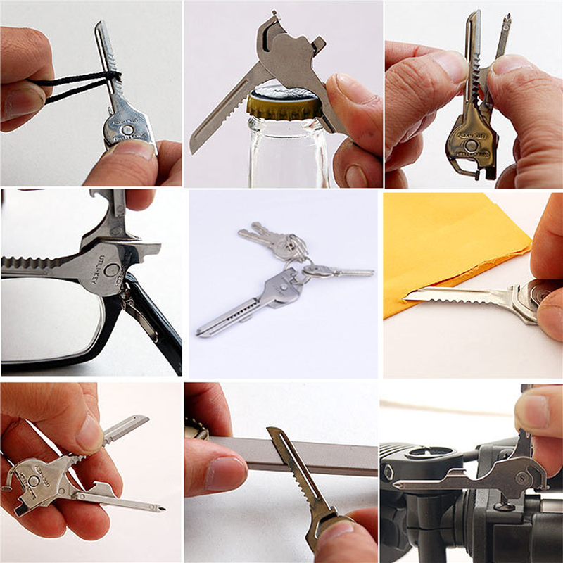 The multifunction keychain is made of stainless steel. The function includes a word screwdriver, a eyeglass screwdriver, a sawtooth blade, a bottle opener, a cross screwdriver, a flat blade