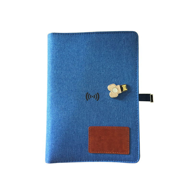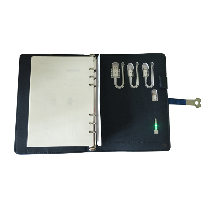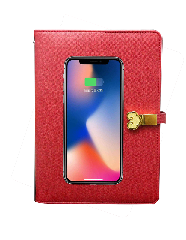 Multifunctional notebook contains a usb drive, a portable power source, and wireless charging. Logo can be imprinted on it.
