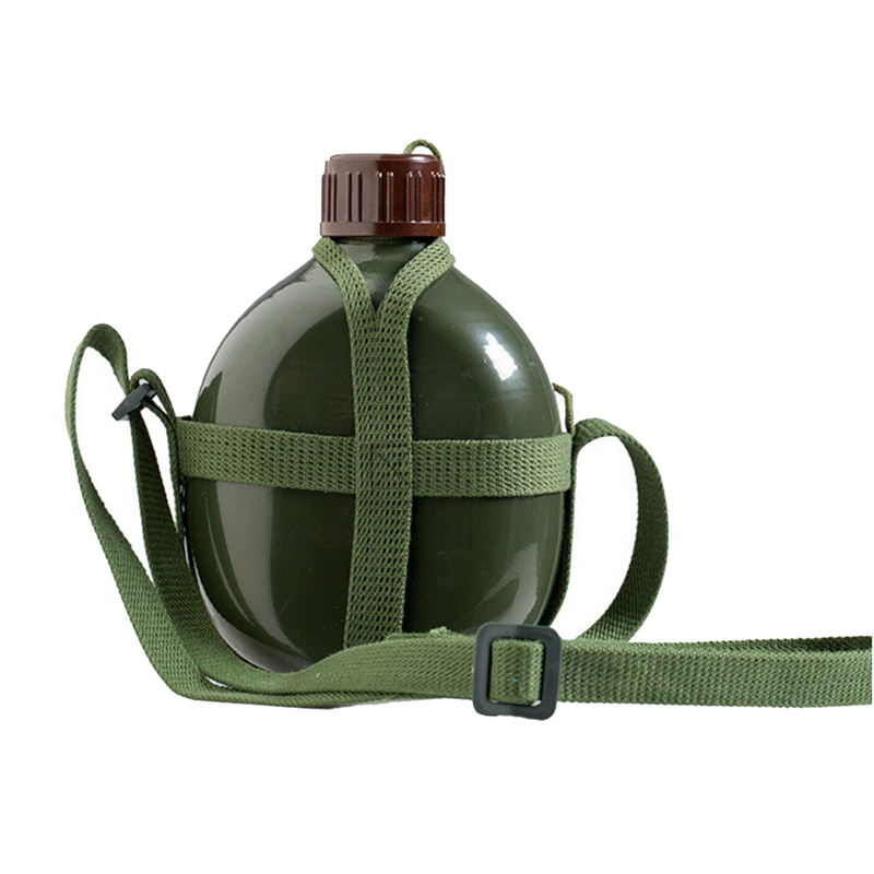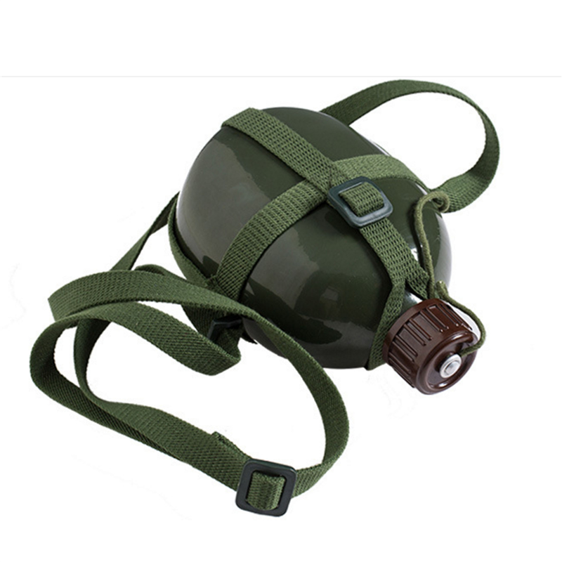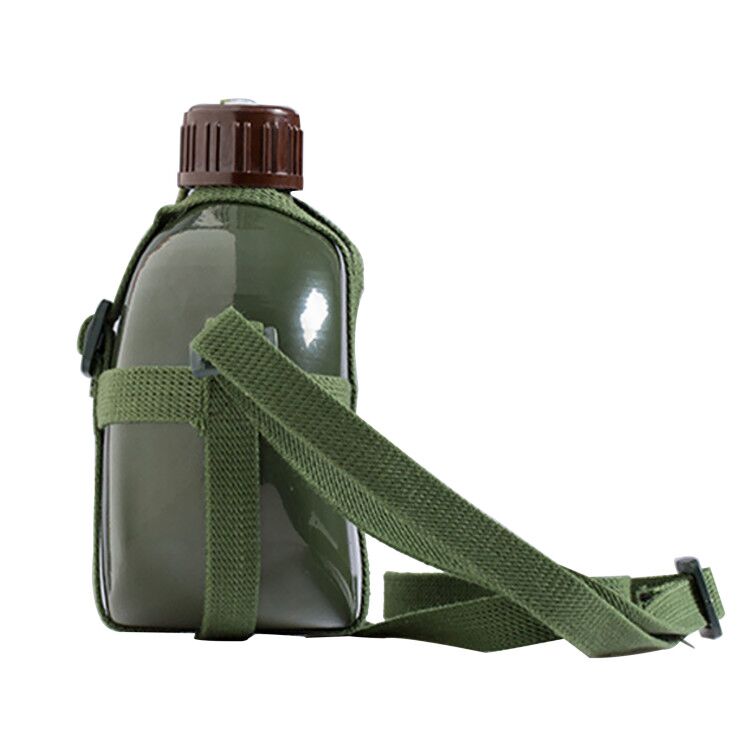 It is made of aluminum with lightweight, and the size is 1 liter 34oz. The lanyard make it easy to carry and it is very good for camping and hiking.