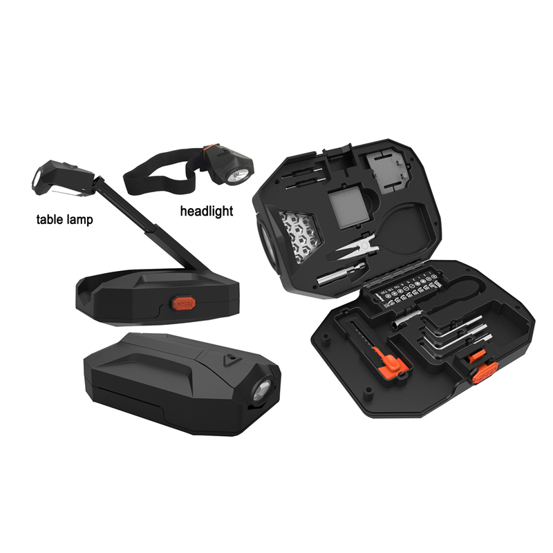 This tool set includes 1 pc forged pliers, 1 pc knife, 3 pcs hex keys, 1 pc tape, 1 pc screwdriver handle, 1 pc connecter, 10 pcs screwdriver bits, 4 pcs mini screwdrivers, 1 folding table lamp and 1 torch. The torch coming with belt, can be used as head lamp. The set is not include the battery.