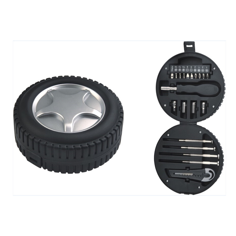 This set has tire shaped case, coming with 4 pcs sockets, 1 pc knife, 4 pcs precision screwdriver and 10 pcs screwdriver bits.. 1 pc screwdriver handle