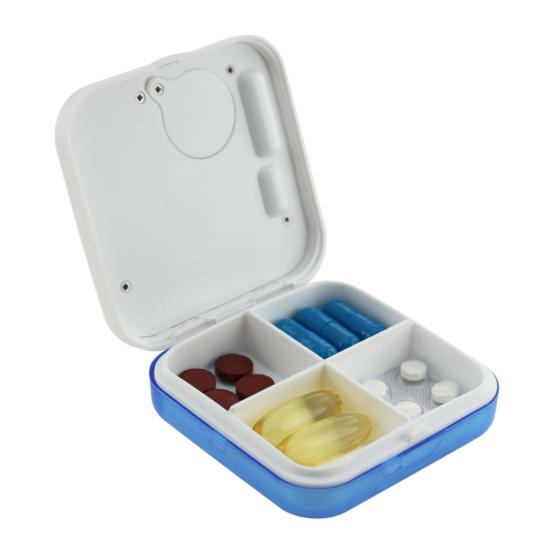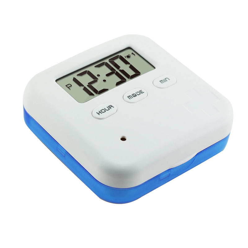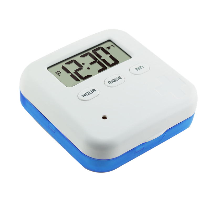 This pill box has 4 inner boxes, coming with alarm clock, the clock work with battery.