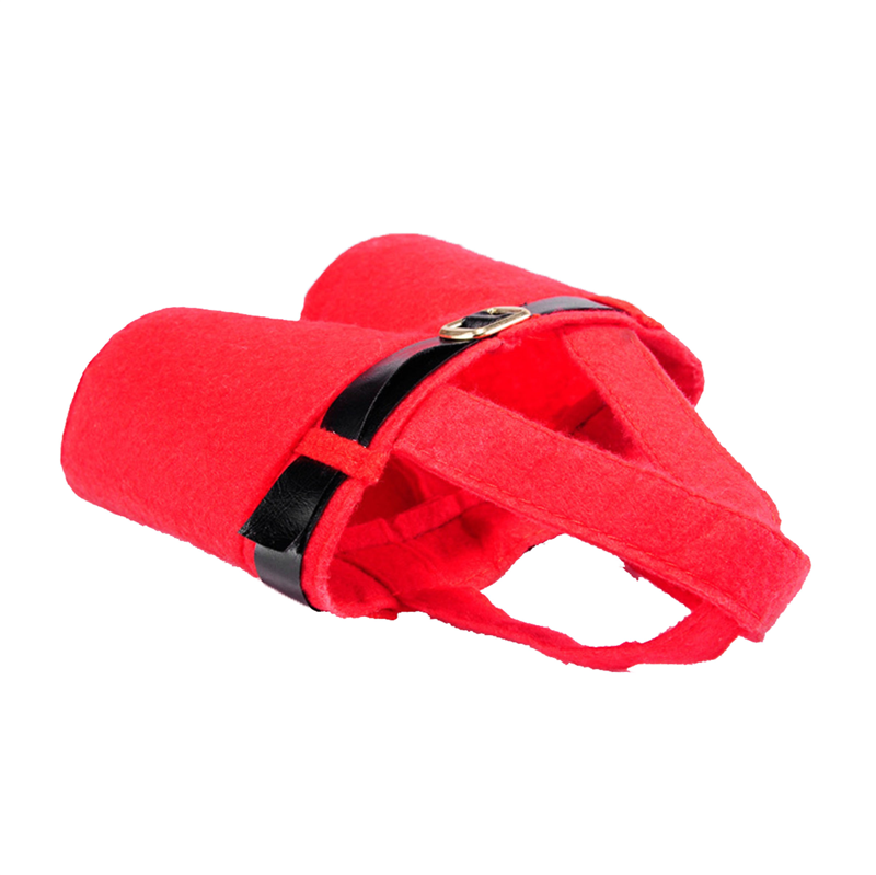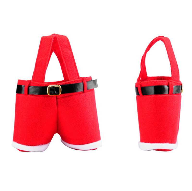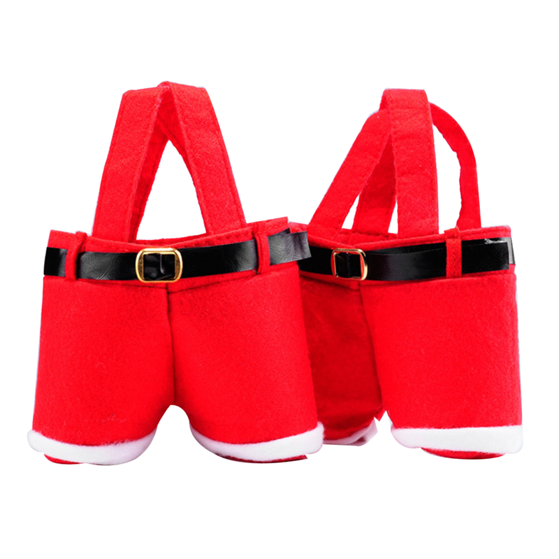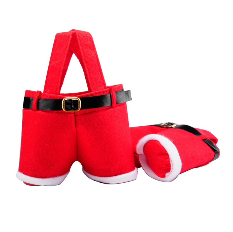 It is made of fleece material. Special design with santa pants candy bag. It is suit for holiday party, christmas gift, fun christmas decorations and etc,.