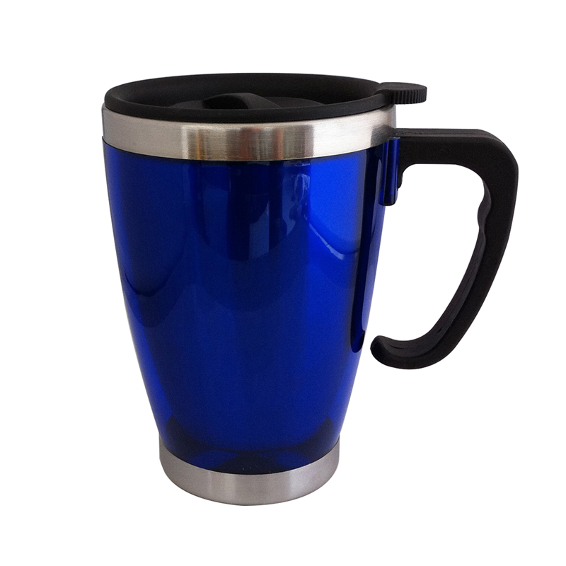 Set your brand on the road to success with this 15 oz. stainless steel mug! This classical promotional mug features an external plastic for heat isolation, an L shaped plastic handle and a stainless steel inner bottle. It has a large area ready for a silkscreen imprint of your company's name and logo, making it a great marketing tool for any occasion, trade show, sales meeting or other corporate gathering. The shell colors available are red, blue and green, as well as assorted colors. Speed up the spread of your branding message!