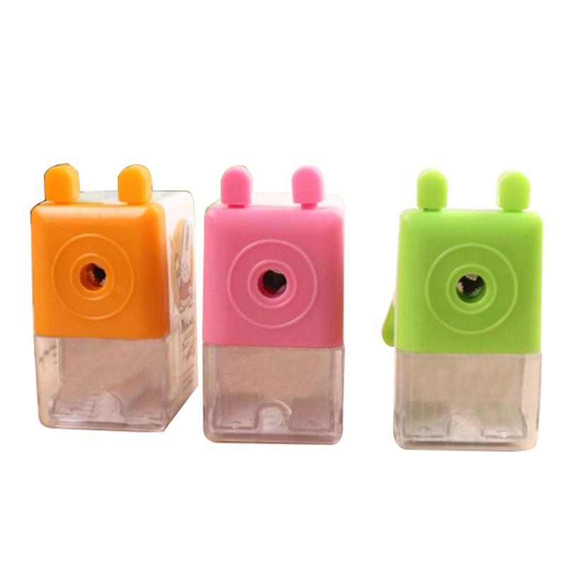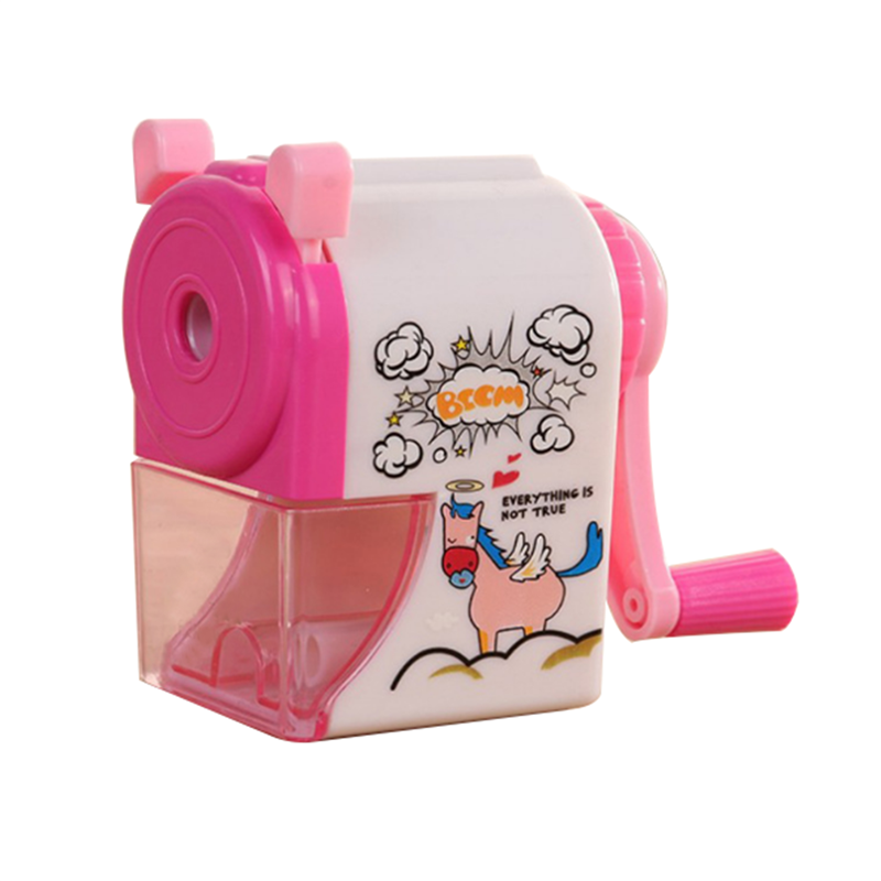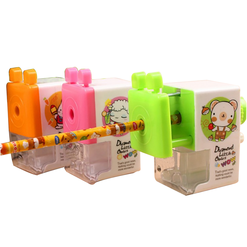 It is made of plastic. This kids pencil sharpener is very easy to operate and clean . It has very cute design on the side of the sharpener. Company logo and name can be imprinted.