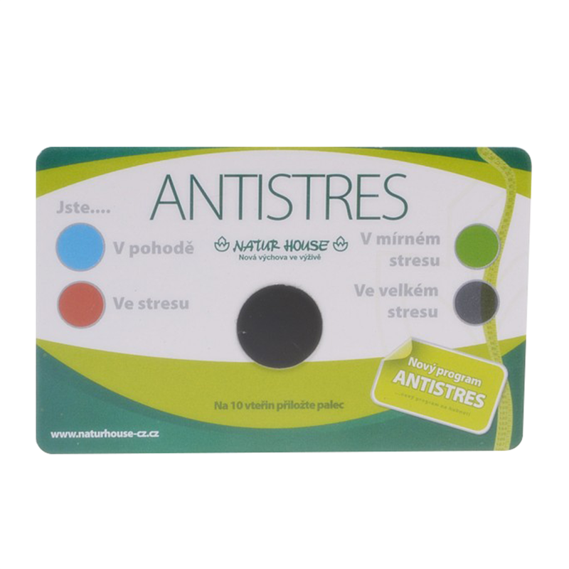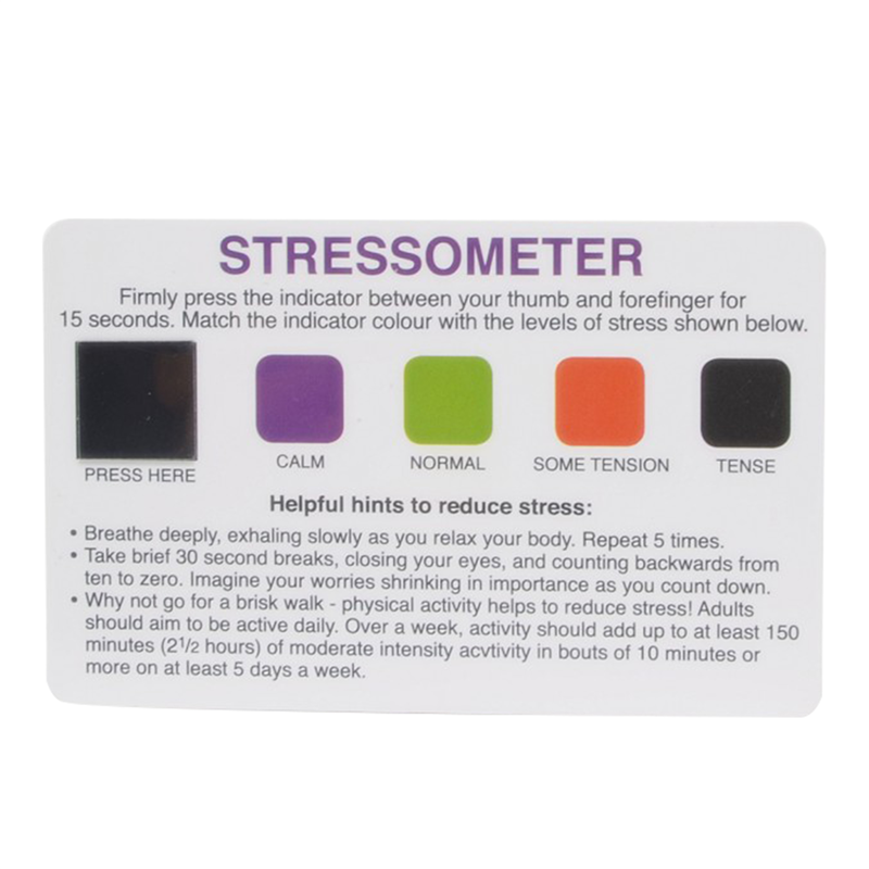 This paper card used for fast stress testing, easy to read. And can be used over and over again. Measures temperature range is 81 degree to 91 degree F. Price include full colors printed on both sides.
