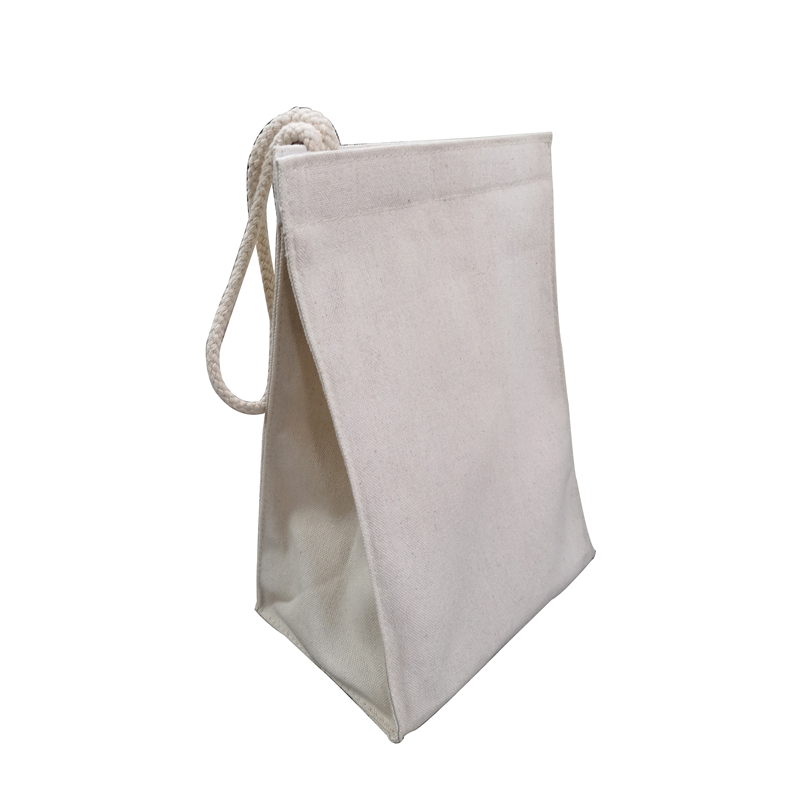 This lunch bag made of 100% cotton canvas, which is durable and comfortable. The hook & look is used on the top to closer the bag. It also come with a hand cord for carrying.