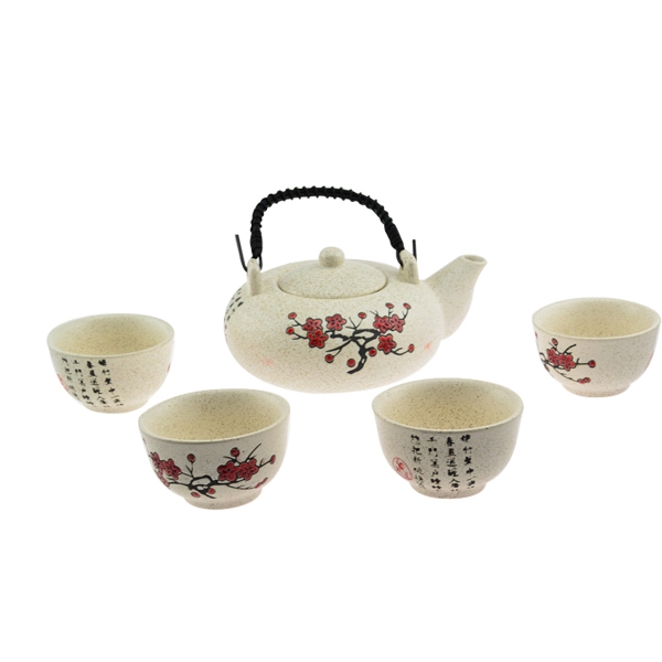 Chinese Teapot Ceramic Set,1 Tea Pot Grapes and 4 Tea Cups Cherry Blossom for Restaurant and Home