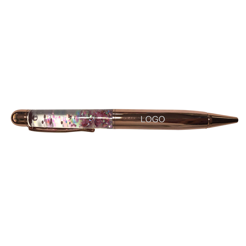 These pens are made of metal, and they won't peel off. The upper end of the pen is an empty tube with a flowing liquid, and various colors of gold powder float in the liquid.The pens write smoothly with black ink, and will not leave dry spots.