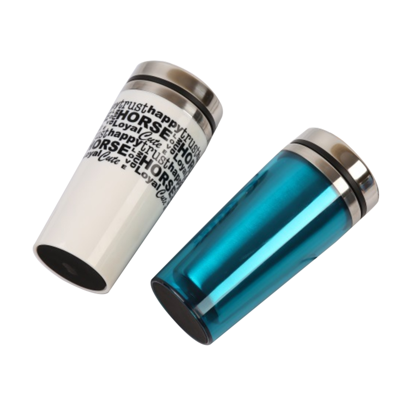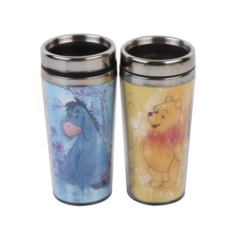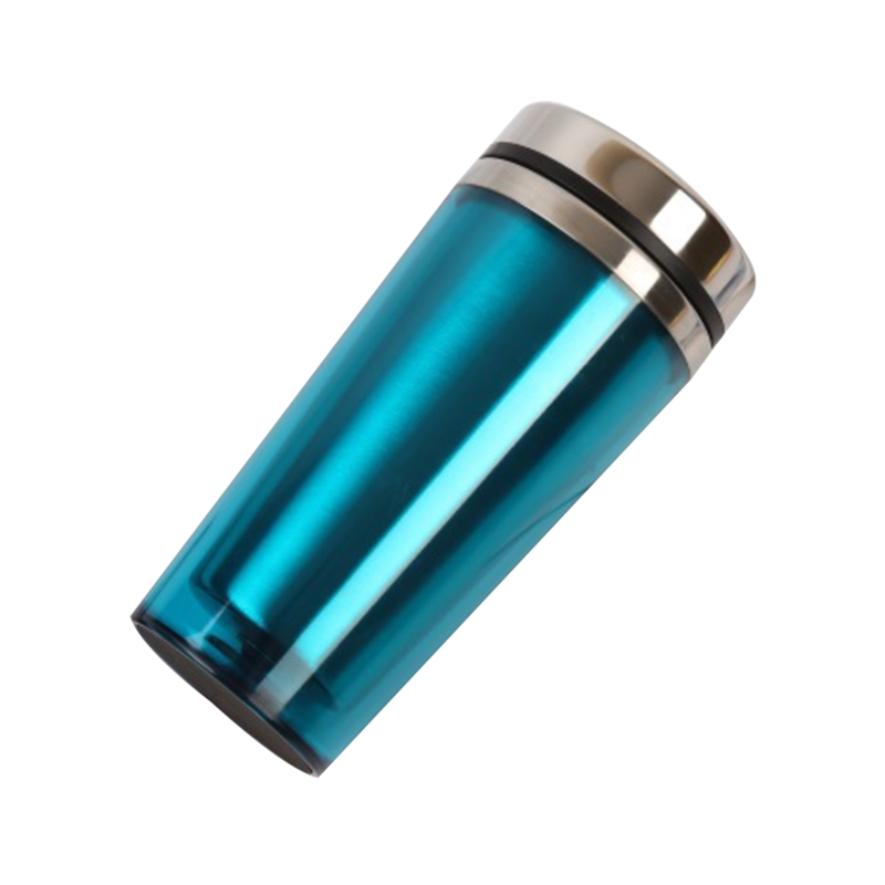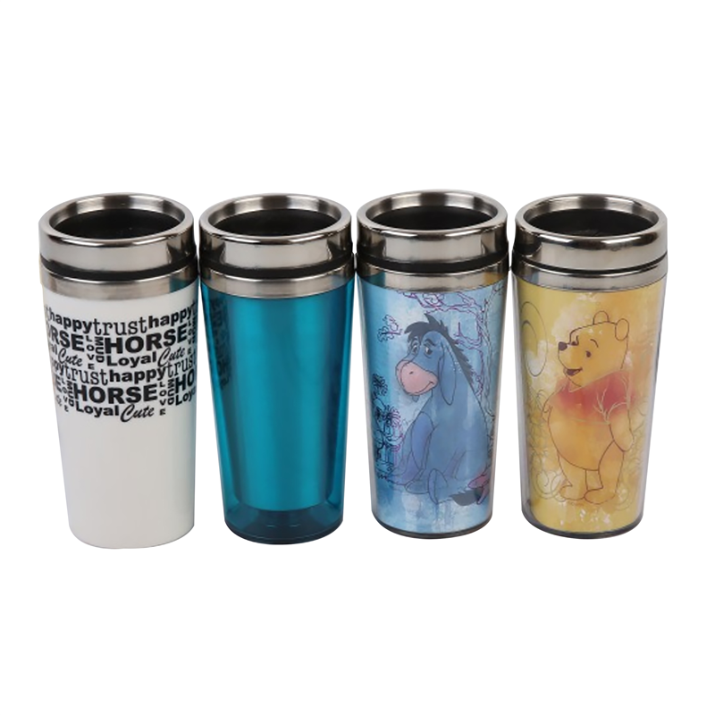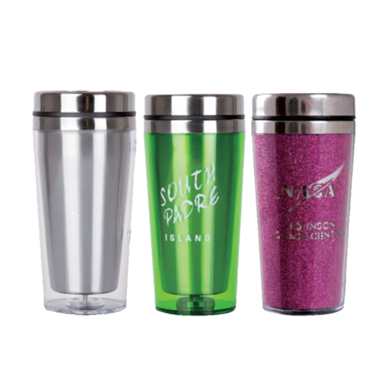 Popular 16 oz coffee mug travel mug tumbler. Double walled construction with a durable acrylic outer sheel and stainless steel inner liner. Standard drink‐thru lid with thumb‐slider lock.